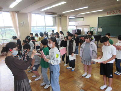 朝から明るく、元気のよい歌声が体育館に響きました。表彰や近江八幡市との交歓会の紹介など、いろいろなメニューがあった終業式でしたが、みんな話をきちんと聞いていてすばらしかったです。