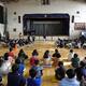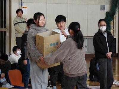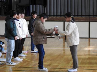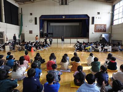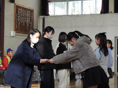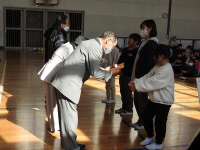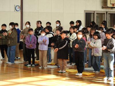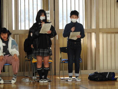 22日のロング昼休みに、全校児童が体育館に集まり、児童会交代式を行いました。