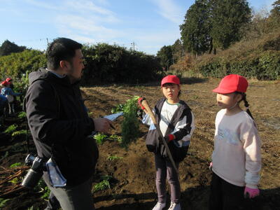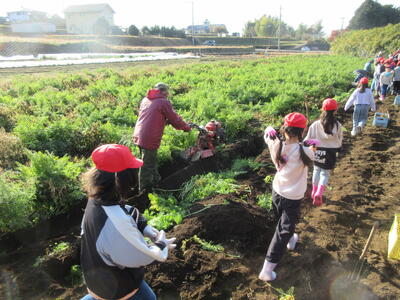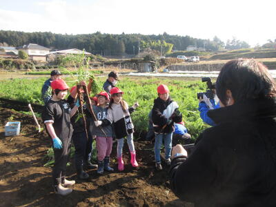12月11日 3年生村山人参収穫 投稿: ホームページ編集者 (09:07) 7月1日に種をまいた村山人参の収穫の日です。作業のために沢山の方が準備をしていました。 今日はその方々と一緒に収穫を体験させていただきました。 学習発表会の時点では、まだ「う宮~な」では販売されておらず、実際の村山人参を食べることはできていませんでしたが、今日は自分たちで収穫したものを1本ずついただいて帰りました。どんな料理にして食べたのかな?